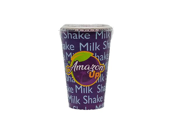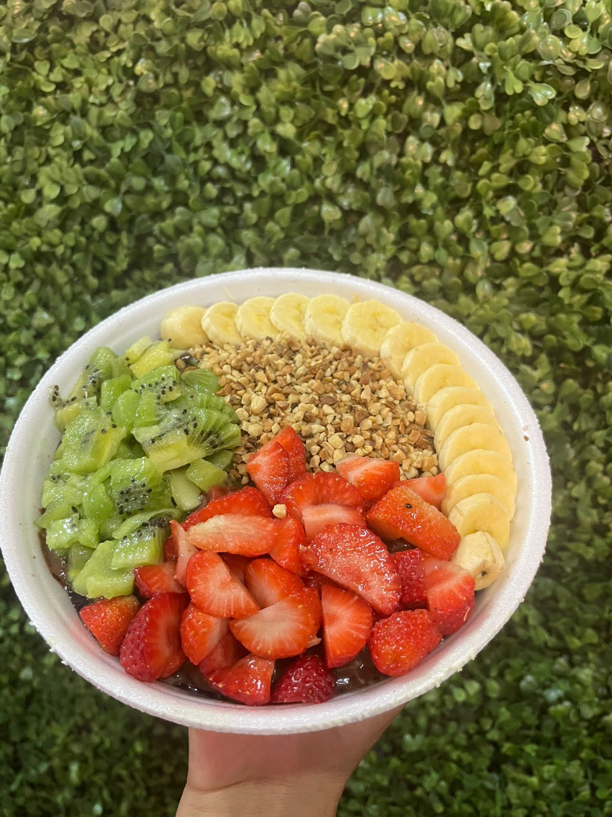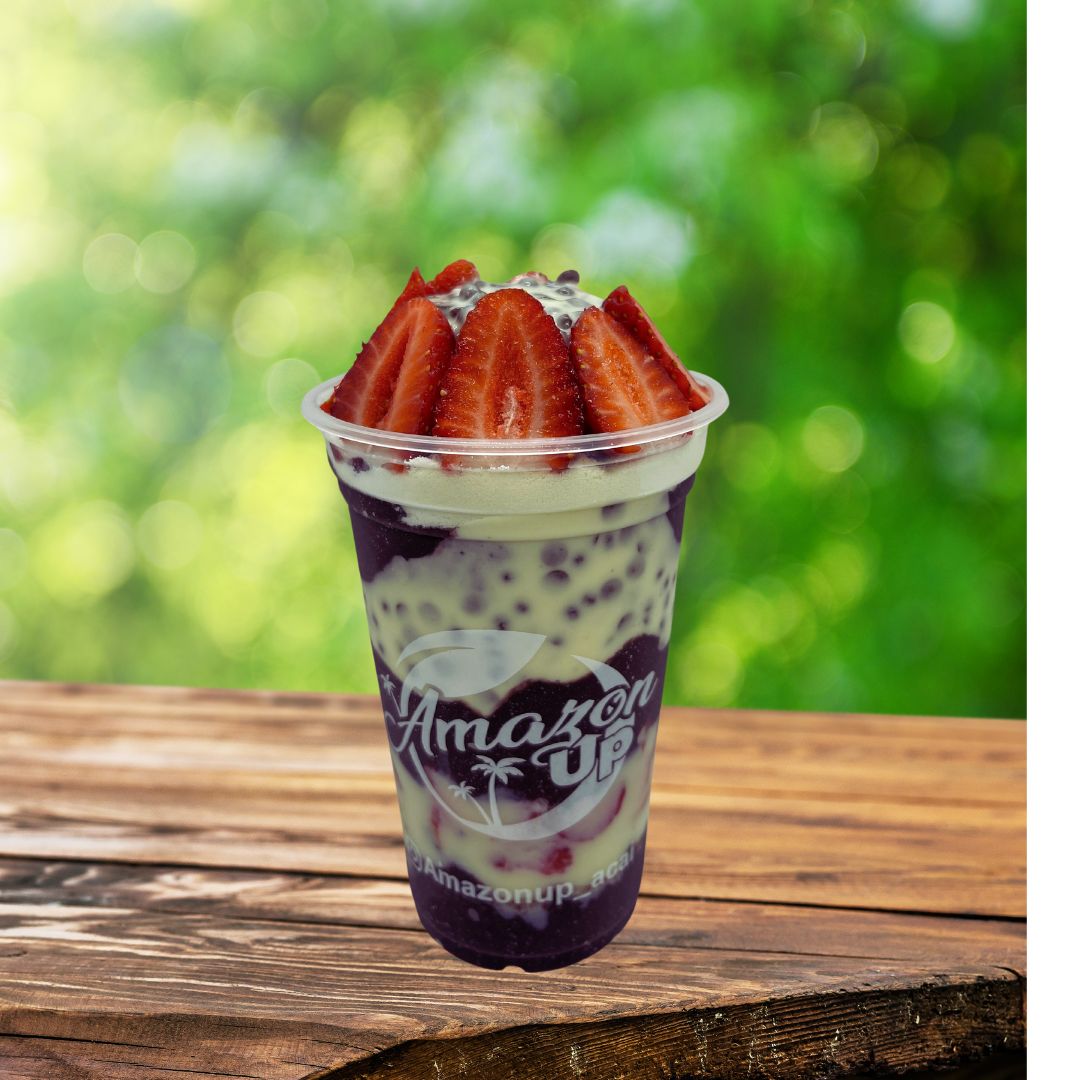 Copo de açaí com leite condensado, leite em pó, morango, uva e banana.