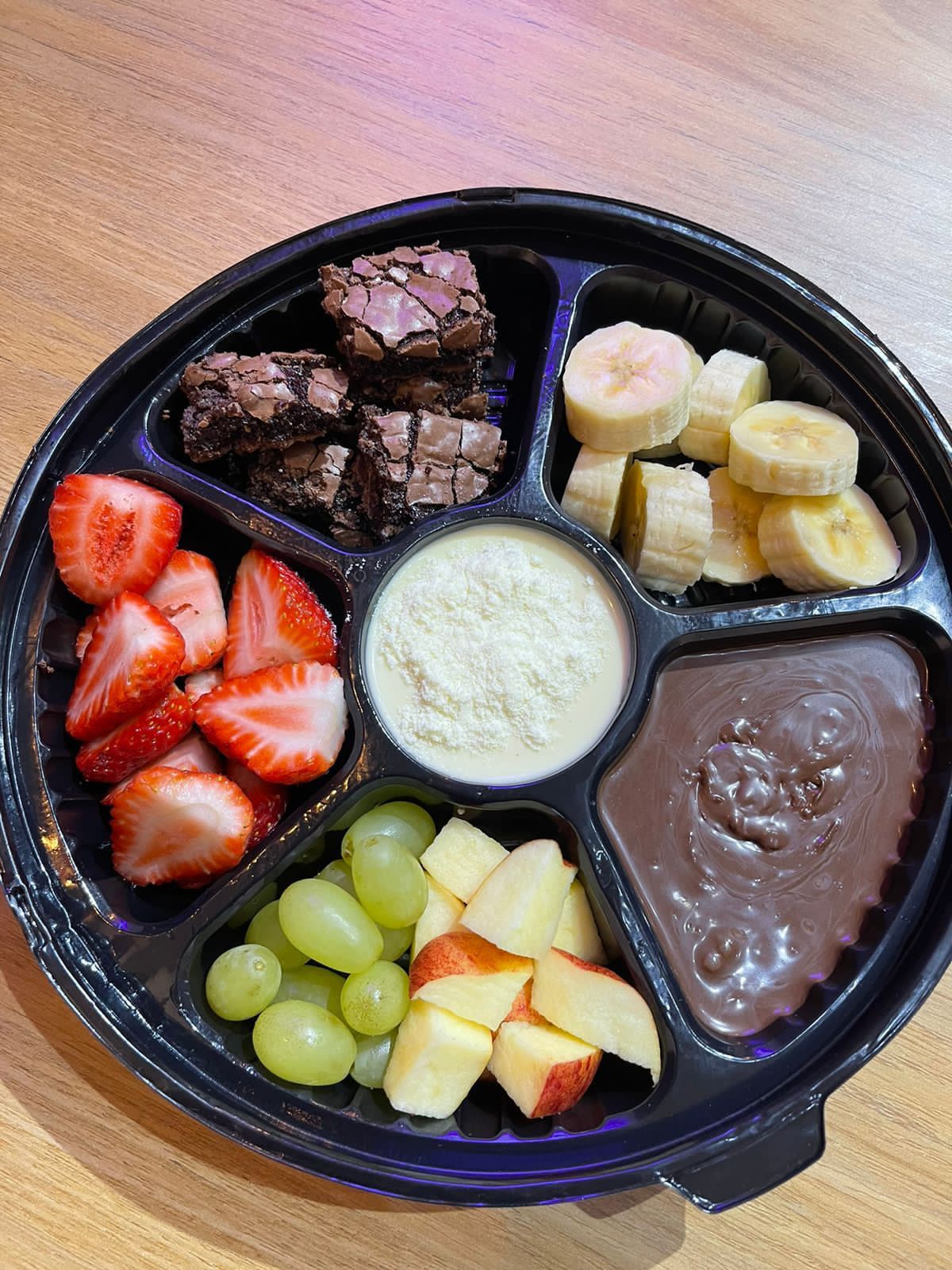 Fondue no pote com brownie, banana, uva, morango, creme ninho e creme de avelã. Porção individual.