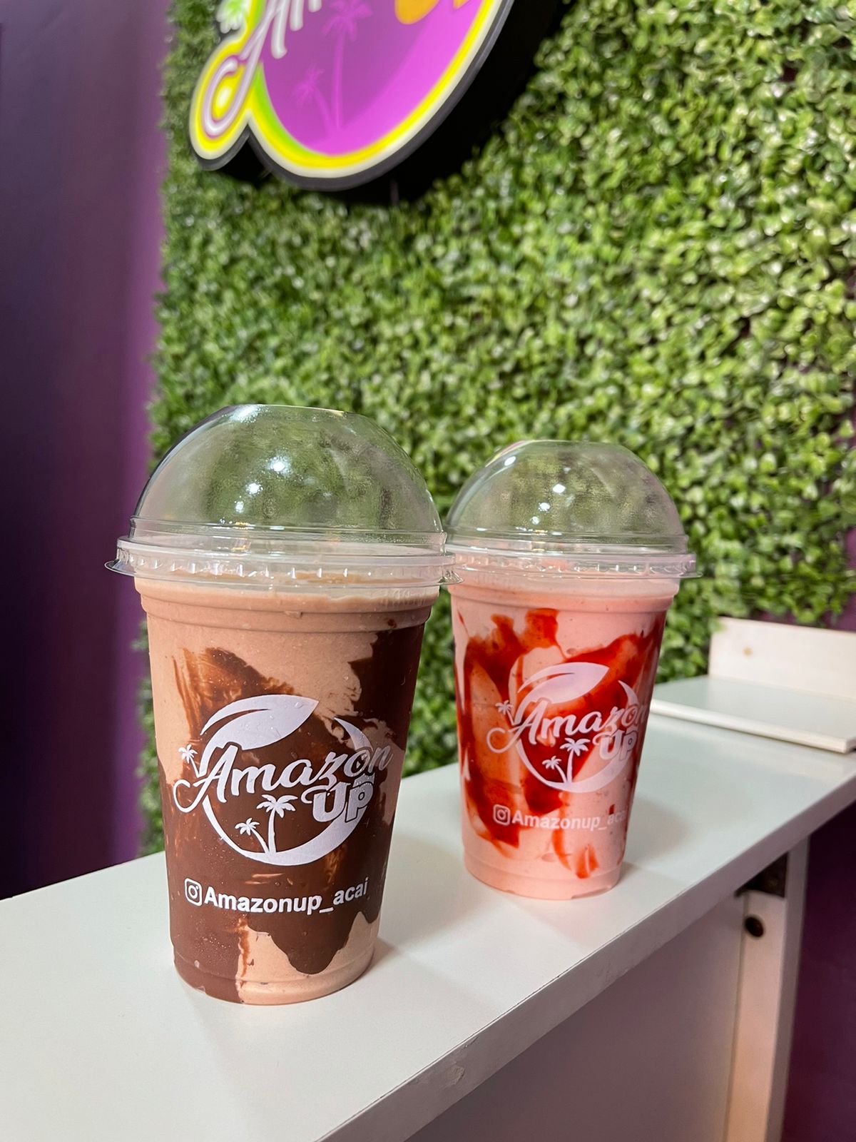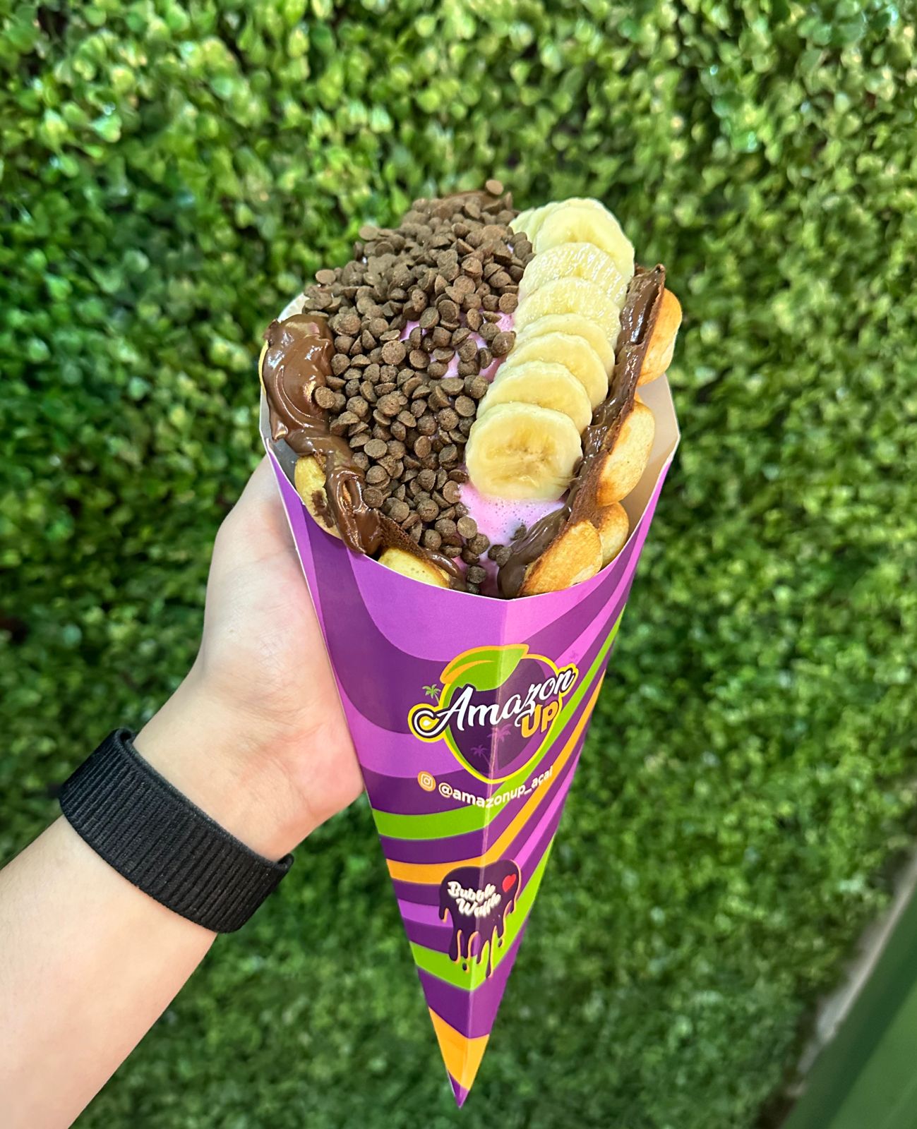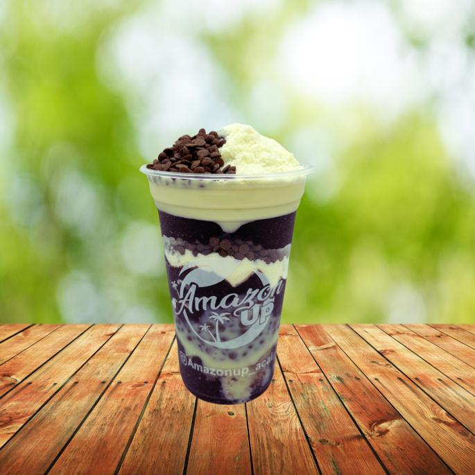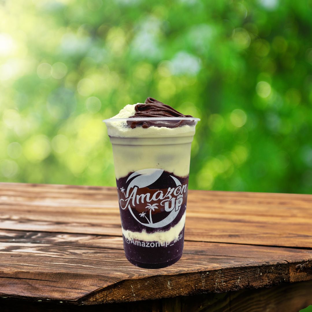 Copo de açaí com leite em pó, creme de leite ninho e creme de avelã.