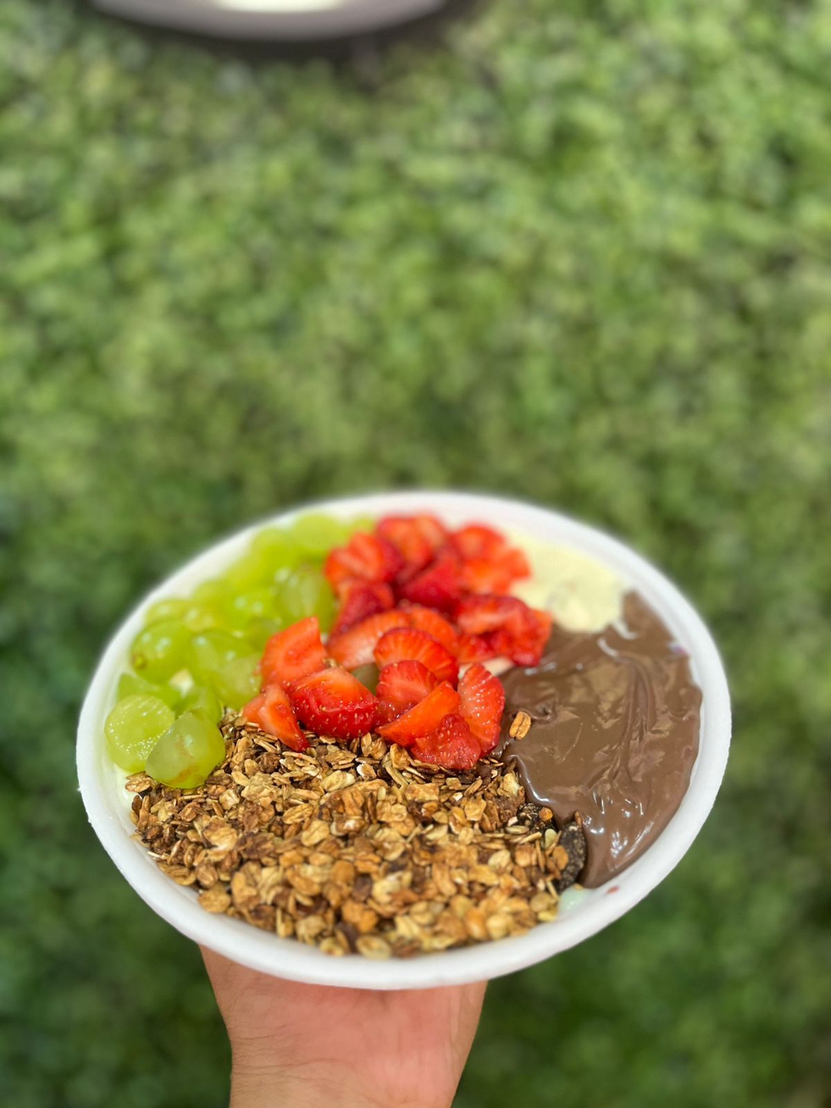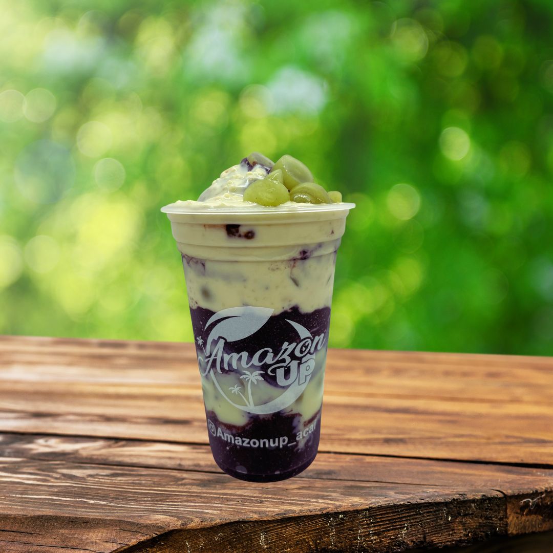 Copo de açaí com leite condensado, uva verde e creme de ouro branco.