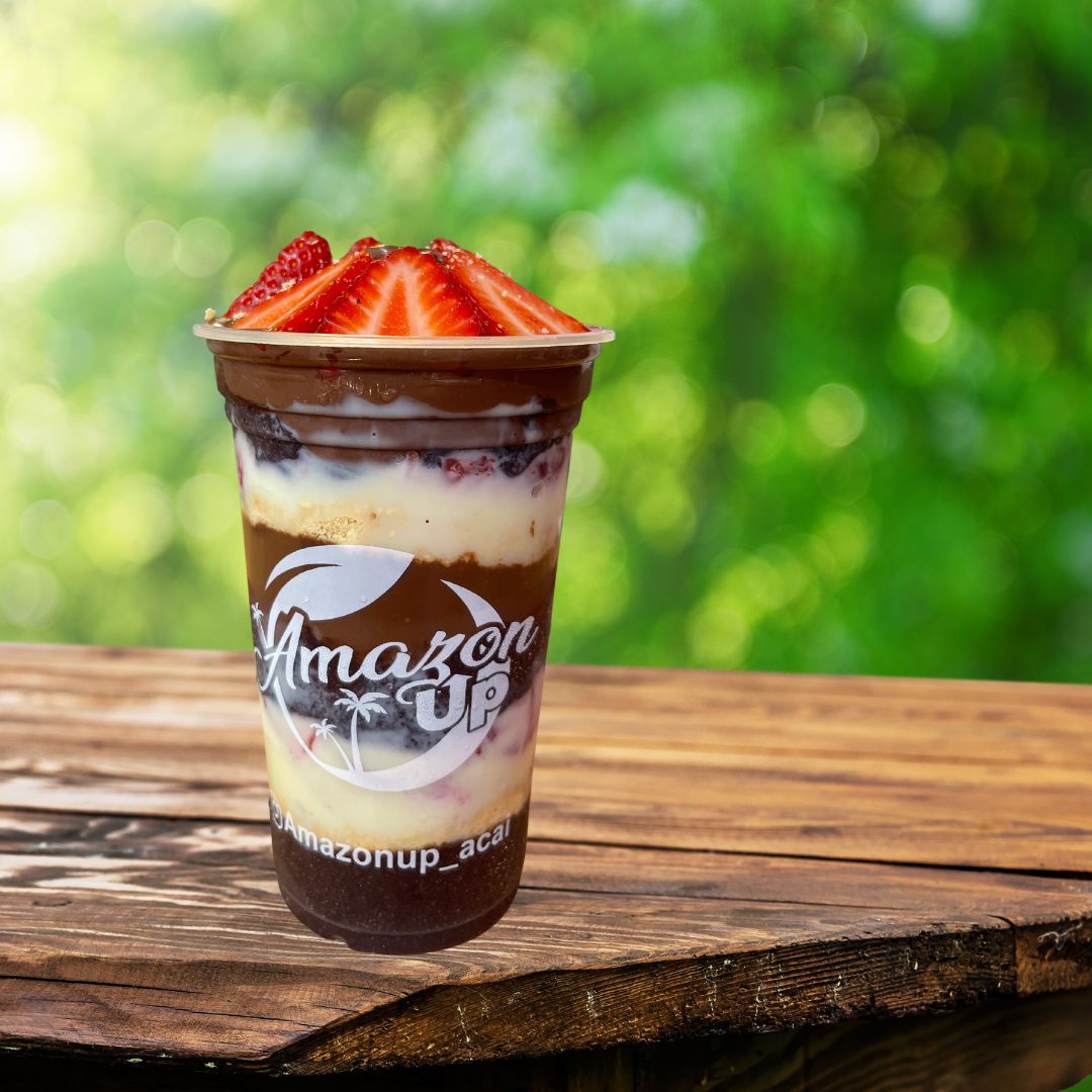 Copo de açaí com leite em pó, leite condensado, creme de avelã e morango.