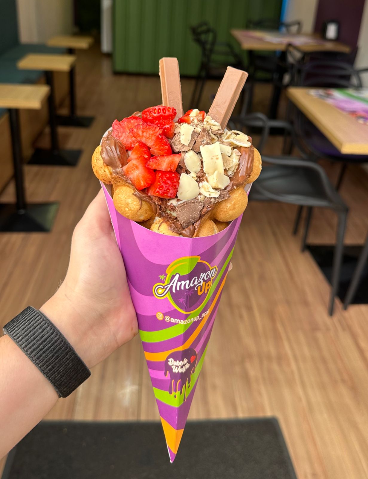 Massa de waffle, recheio gourmet, sorvete e 3 opções de complementos inclusos.