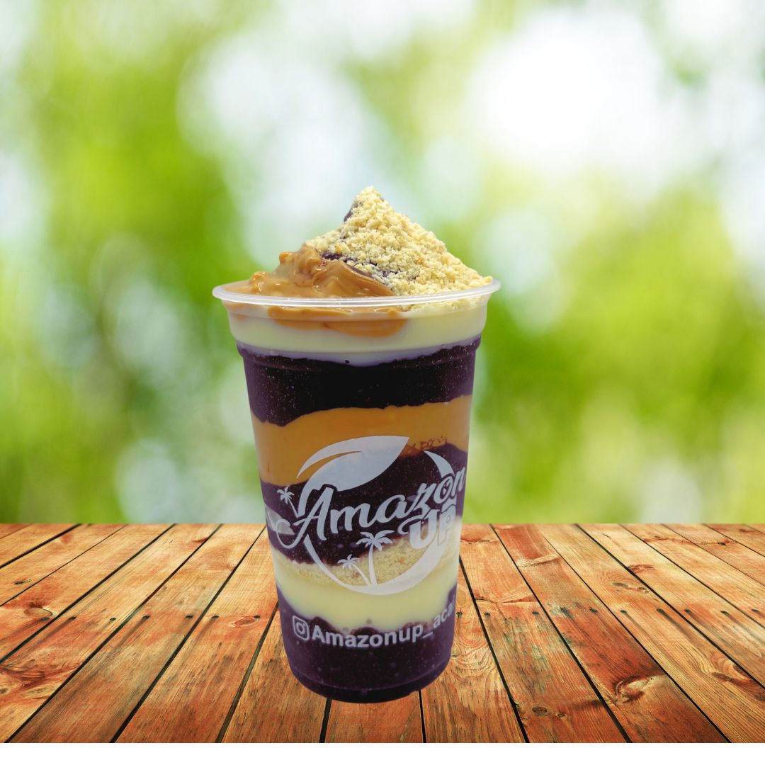 Copo de açaí com leite condensado, farofa de amendoim e creme de amendoim.